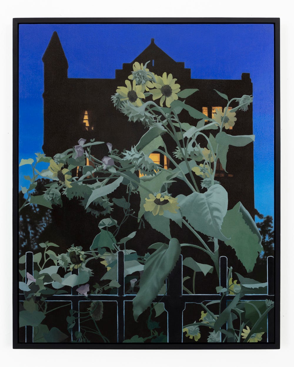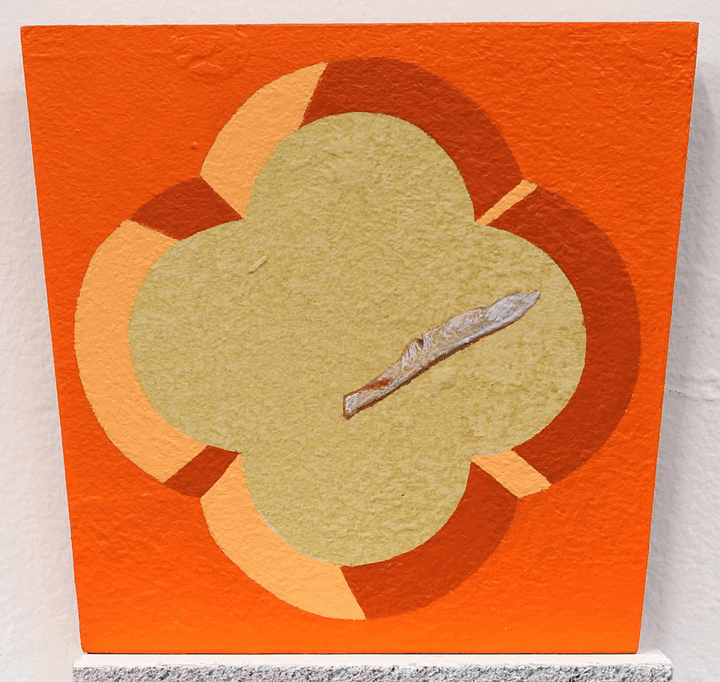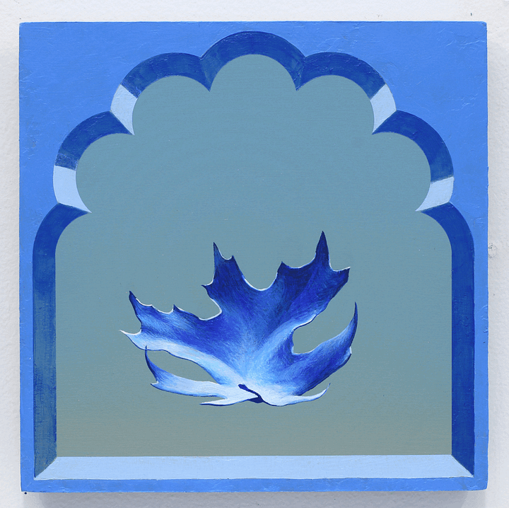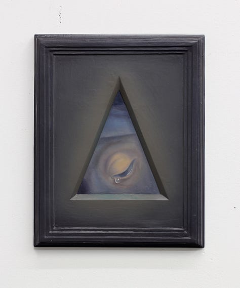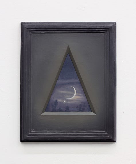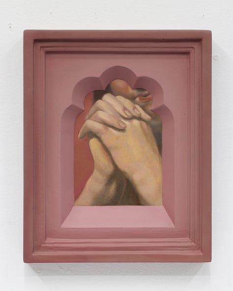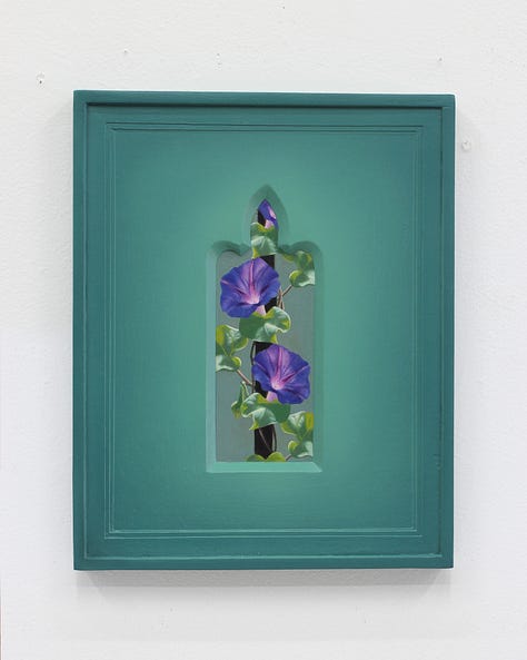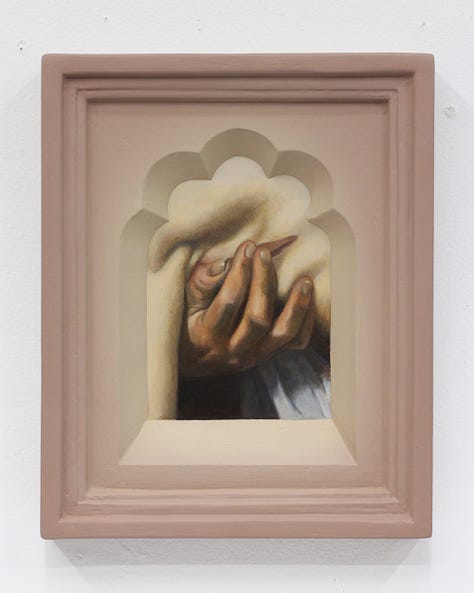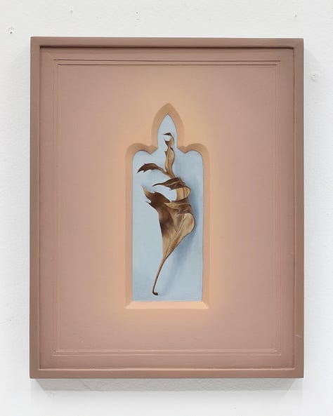 For Cowan, the concept of Paracosm became a generative prompt. While pouring over art books that feature a breadth of Christian imagery, the artist would use variously shaped vignettes to crop details of each image. This reframing served to illuminate the building blocks of the Paracosm we experience as religion, as well as expand its purview to humble plant life that is not generally associated with the canonized symbol set. Within sturdy frames that Cowan makes himself from molds, windows that evoke the negative space of gothic architecture serve to highlight the blessing hand of Christ or the tearful eye of Mary, but also a delicately twisted dry leaf or sun dappled flower. The even treatment of these depictions, made with care that comes from years of studying crafting techniques, end up reorganizing the hierarchy of these images. The leaf becomes imbued with a spiritual air just as the hand of Christ is made earthly. Radiating colors within the field of the frame give an ethereal quality to the composition as well, as if the images held within are actually apertures which open within a void to reveal the partial subjects as clues to a greater meaning.