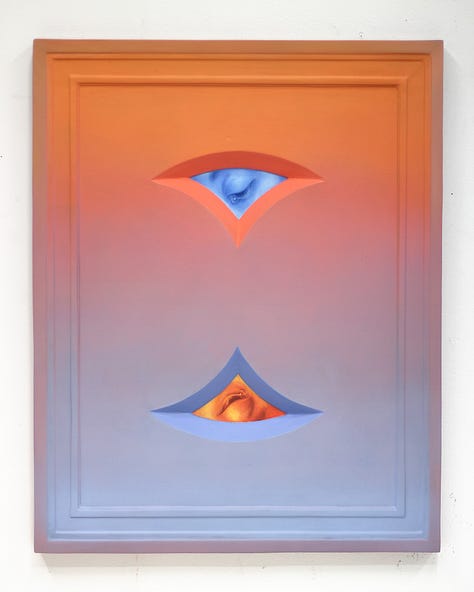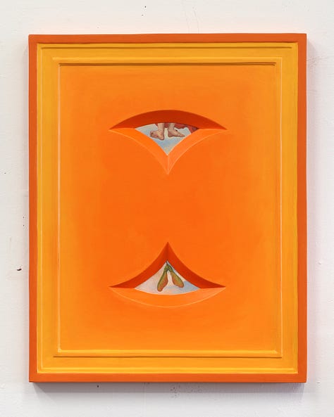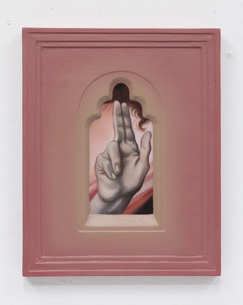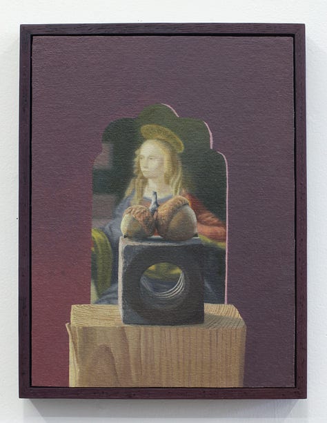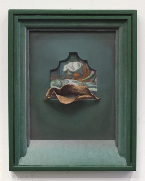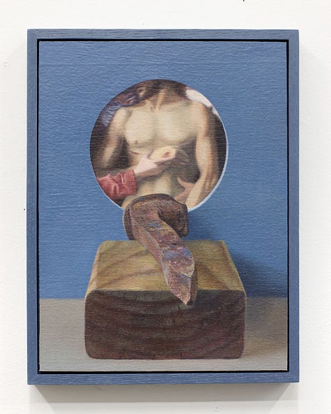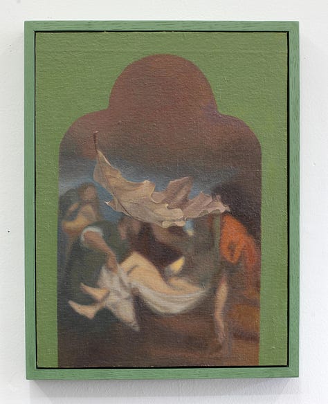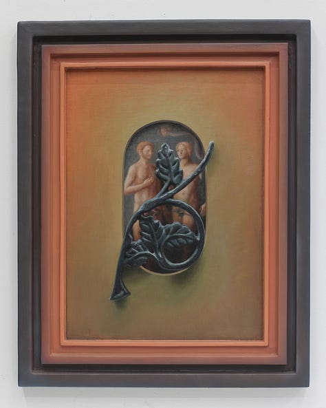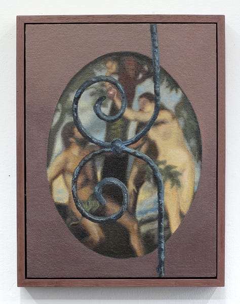 Most working artists today including Cowan hold a degree from an arts institution, but few in this demographic can also claim to have trained in ministry for a non-denominational charismatic evangelical church in their formative years. Ben Cowan’s experience in this milieu began as an exciting adventure with a relatively fringe culture. Exorcisms, speaking in tongues, and being overtaken by spirit were all regular occurrences in this community, and Cowan initially harbored hopes of knowing firsthand what it felt like to levitate and practice teleportation. Over time, he received the opportunity to “plant” a new church in Brooklyn where his responsibilities to the community grew. It was at some point during the development of this plant that doubt began to set in. What was once felt to be an exhilarating experience of faith and fervor, all of a sudden became a source of overwhelm and trauma. Cowan decided at this moment to step away from the church where he had risen to prayer ministry lead because of an increasing awareness that some connection to God had been lost. In the artist’s words, “I was coming to terms with the feeling that the Jesus I knew was dead, and I had killed him. I needed to get rid of everything and then start bringing things back to see what is beneficial for me. I started painting the Dear God paintings as a way for me to grieve this loss.” The Dear God paintings generally depict a more somber side of iconography with depictions such as Adam and Eve quoted from a Tommaso Masolino Da Panicale painting, obscured by ornamental iron leaves, and Christ’s body quoted from Poussin paired with a curled dead leaf. Each figure is paired with an object that becomes associated by proximity, though there remains a feeling of disjointedness. A framing device is also utilized in these compositions, but interestingly this effect is achieved through trompe l'oeil which heightens the sense of being confronted with illusions. Something that was once there, had been proven ephemeral yet is still depicted, with this complex visual metaphor standing in for equally complex grief.