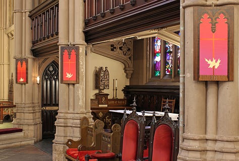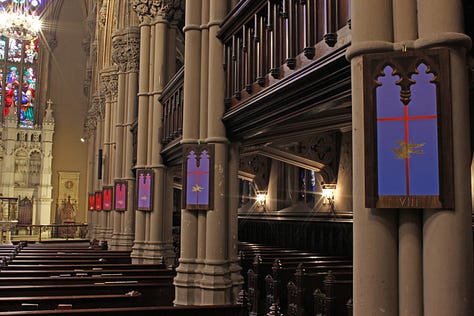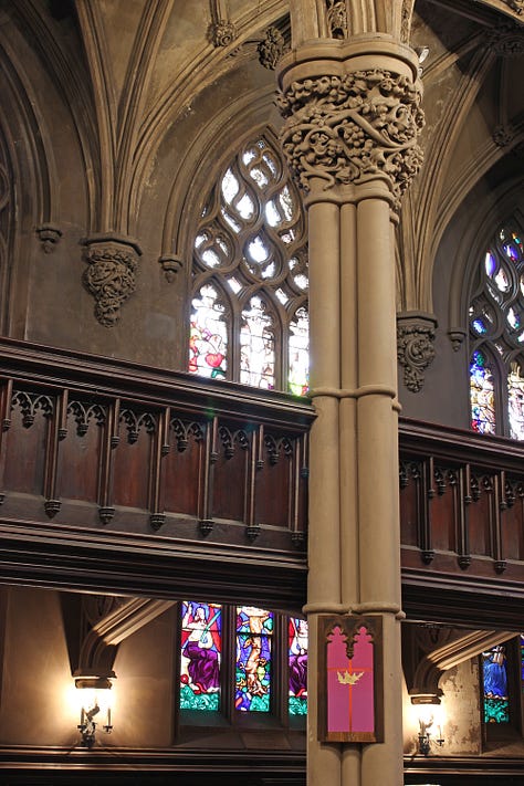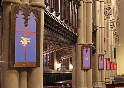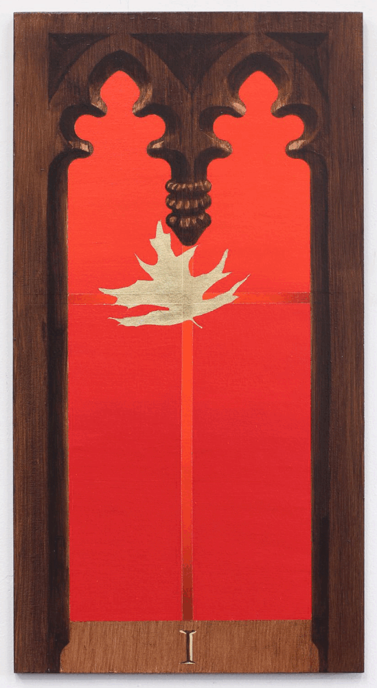 Joining Saint Ann and the Holy Trinity Episcopal Church in Brooklyn was an event that marked a renewal of faith for Cowan. Here was an environment that embraced creativity through panel discussions, ambient concerts, folk festivals, and more. Their focus on maintaining the grandeur of their original architecture and tradition combined with a progressive view on politics and the diverse identities of church members was a welcome change. It was here that Cowan was also invited to create an absolutely stunning installation of paintings that represent the Stations of the Cross through his recurring symbol of a leaf, this time subtly falling down the length of an intersected crimson pinstripe. In this installation, the gradation of the surrounding color gives an impression of a vibrant field of light that exists on the other side of the window of each painting surface. This portal effect is heightened by Cowan’s expert rendering skills in creating another frame within the frame of each piece, mimicking the ornate architecture of the church interior with a faux wood effect. While each piece is simple in concept, viewing the works together in this context brings forth a feeling of immersion as they are spread around the place of worship.